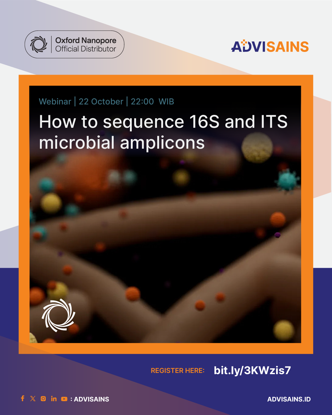 Info Advisains – Jakarta. Terobosan Baru Profiling Mikroba: Microbial Amplicon Barcoding Kit 24 V14 (MAB114) dari Oxford Nanopore. Dalam upaya pengembangan riset mikroba, hadir solusi Microbial Amplicon Barcoding Kit 24 V14 (MAB114) yang memungkinkan screening full-length 16S rRNA dan ITS dengan resolusi yang tinggi dan efisien. Profiling mikroba memberikan manfaat penting dalam riset pemahaman diversifikasi mikroba dalam berbagai ekosistem, identifikasi mikroorganisme penyebab penyakit, hingga memantau kesehatan lingkungan dan keamanan pangan.